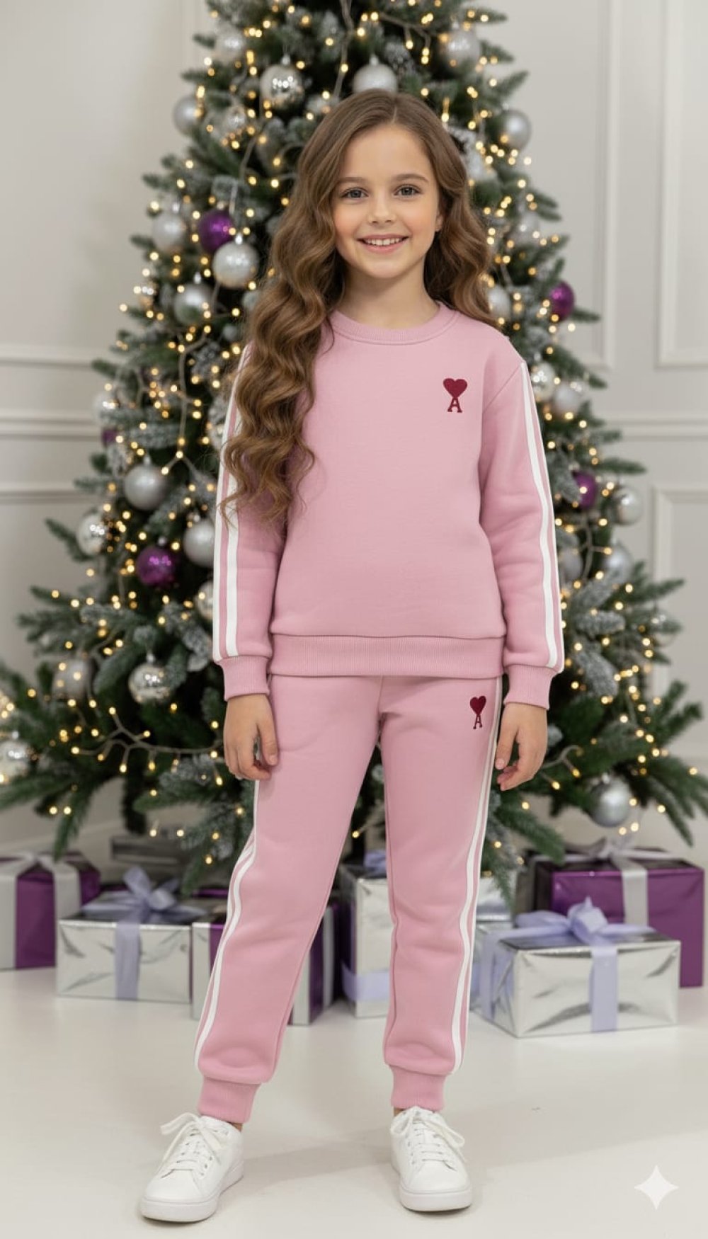 3 İP ŞARDONLU KOLLARI ŞERİTLİ A KALPLİ UNİSEX EŞOFMAN TAKIMI Pembe