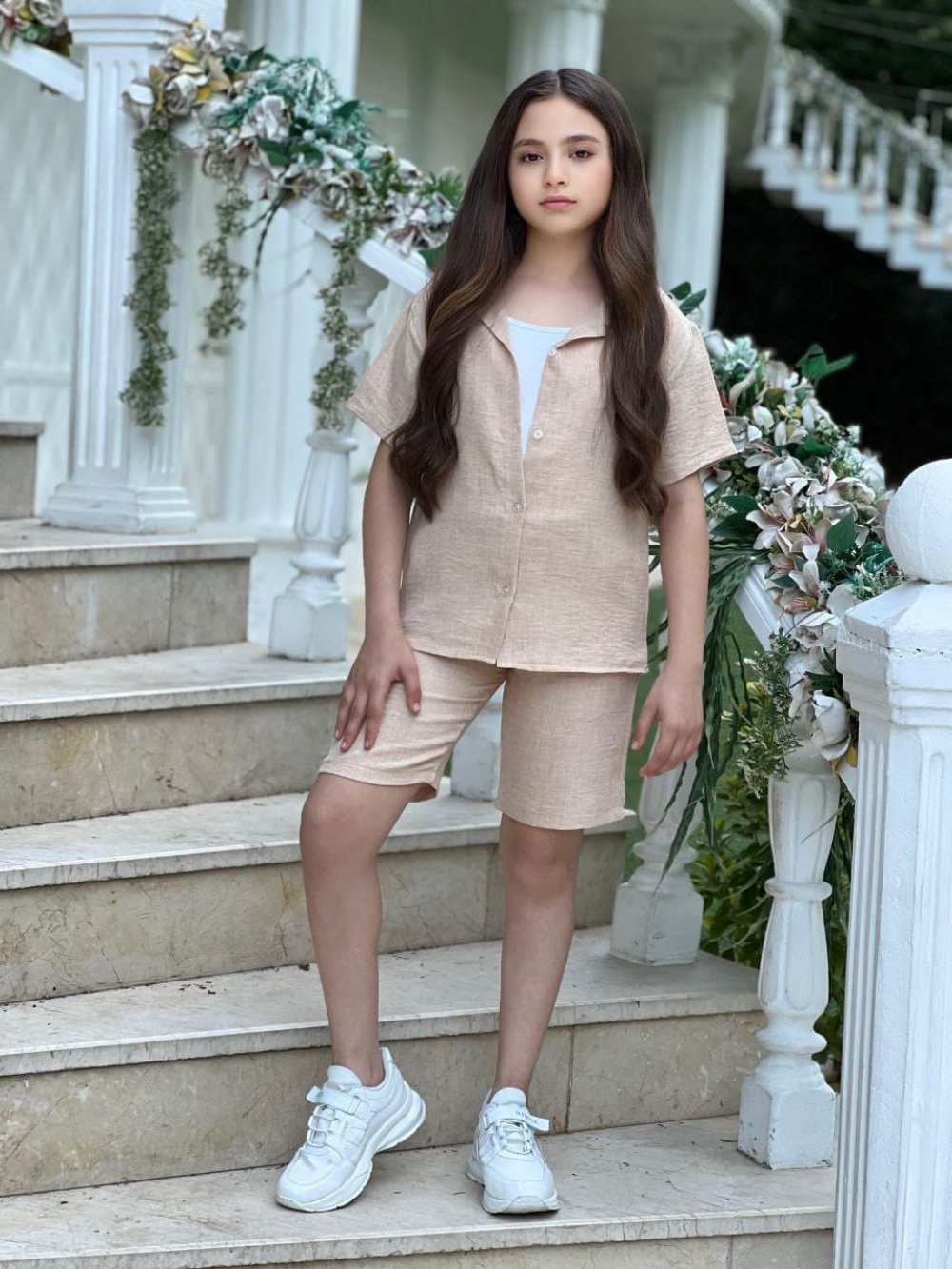 3 PARÇA BADİSİ İP ASKILI KETEN ŞORTLU KIZ TAKIM Bej