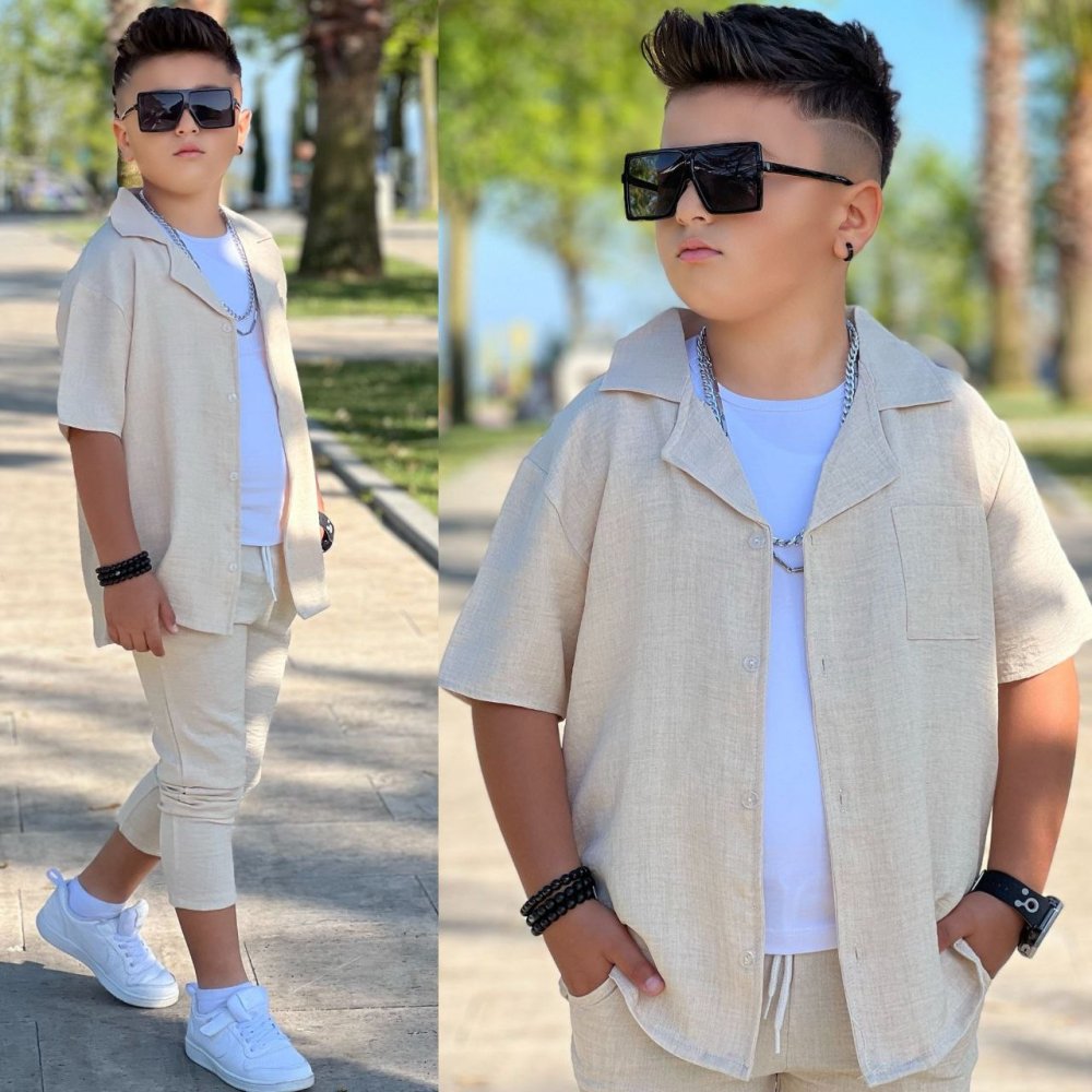 3 PARÇA YAKALI ALT UZUN KETEN ERKEK TAKIM Krem