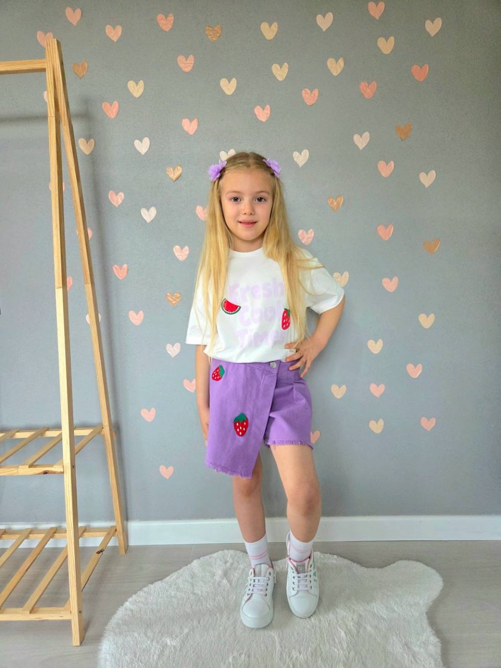 ÇİLEK NAKIŞ DETAYLI KOT ŞORT ETEK TAKIM Lila