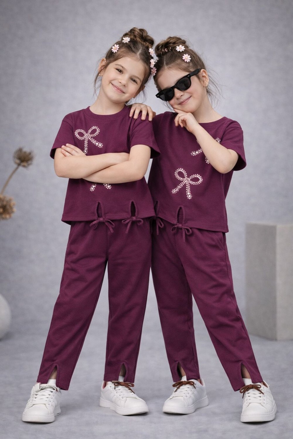 İKİ FİYONKLU TİŞÖRT UCU VE PAÇASI YIRTMAÇLI İPLİ ALT UZUN TAKIM Mürdüm