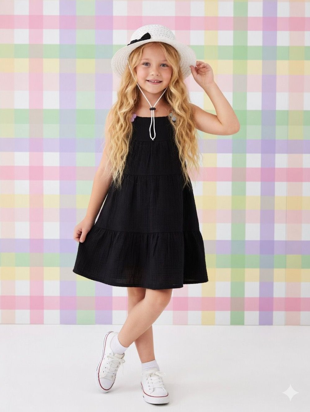 İNCE ASKILI ÇİÇEK DETAYLI ŞAPKALI MÜSLİN ELBİSE Siyah