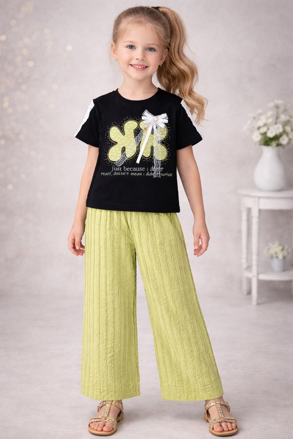 ?✨ Şıklık ve rahatlık bir arada! Kelebek detaylı, fiyonk süslemeli tişörtü ve rahat kesim pantolonu ile miniklerin favorisi olacak ? ? Yumuşacık kumaşıyla gün boyu konfor ? Şık fiyonk detayı ile zarif görünüm ? Günlük kullanım ve özel günler için ideal ? 5/12 yaş ? 600 TL ?️ Stoklarla sınırlı, kaçırmayın!