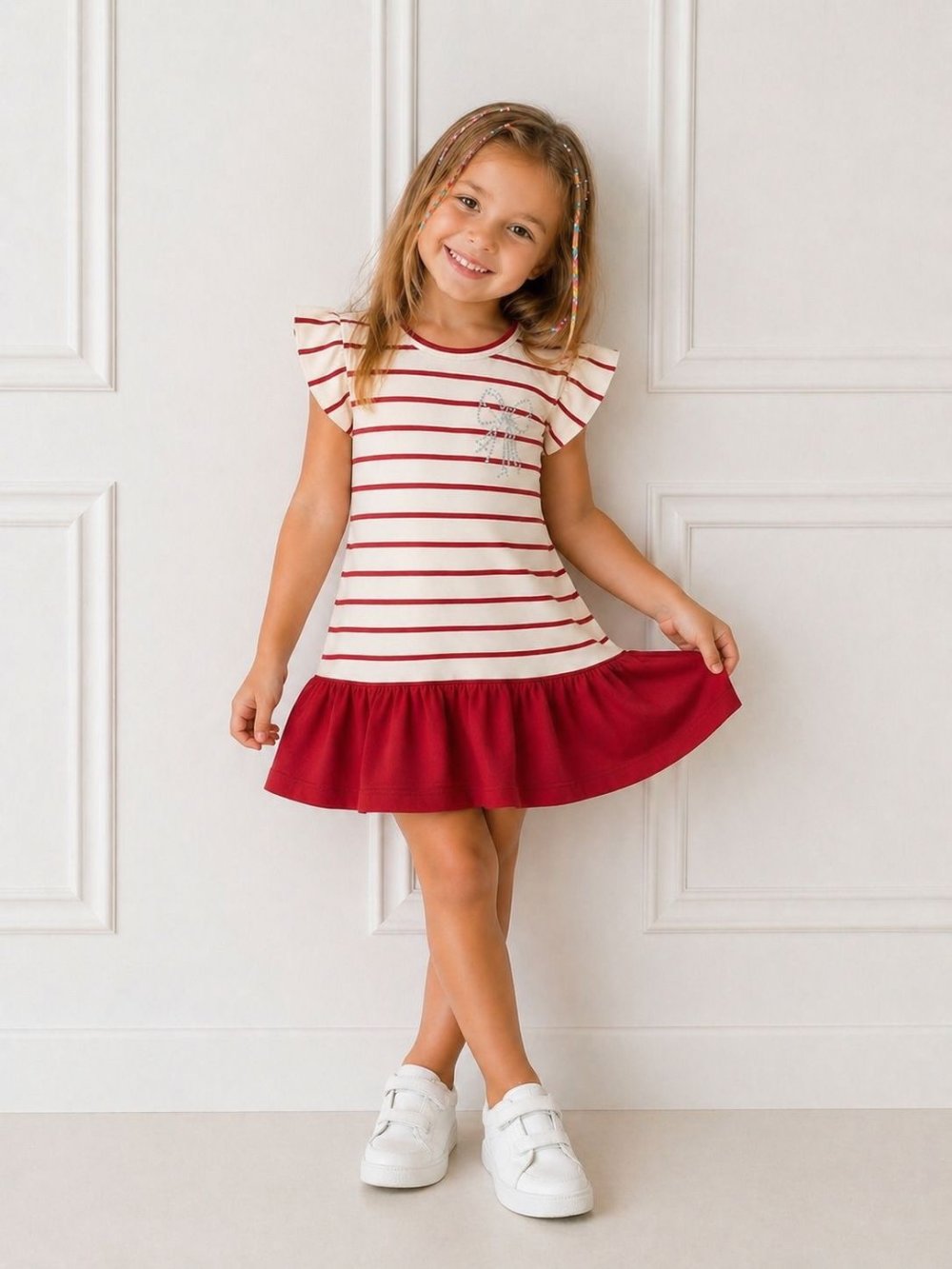 Kampanyalı Kol Fırfırlı Çizgili Elbise Kırmızı