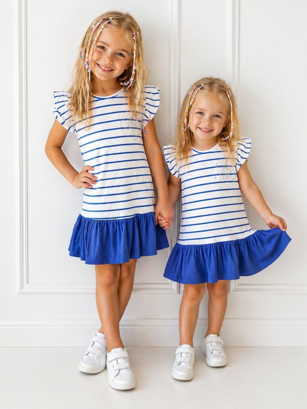 Kampanyalı Kol Fırfırlı Çizgili Elbise Mavi