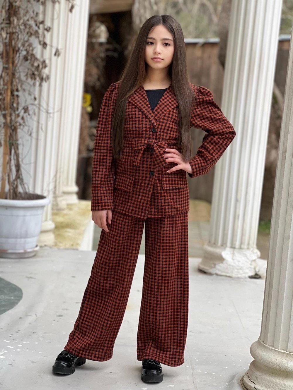 KAZ AYAĞI DESENLİ KIZ CEKETLİ TAKIM Kiremit
