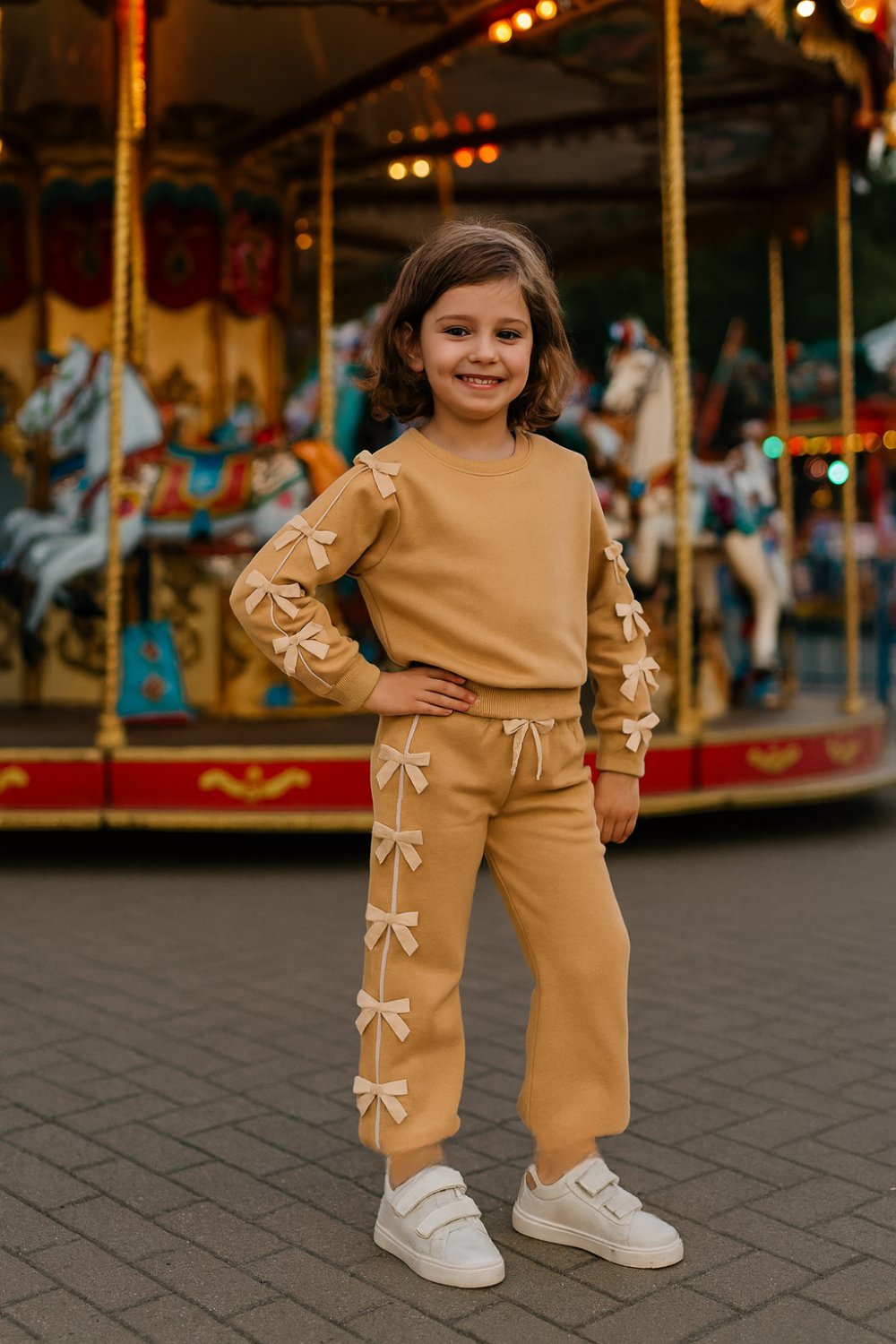 KOLLARI EŞOFMANI FİYONKLU ŞERİTLİ KIZ TAKIM Bej