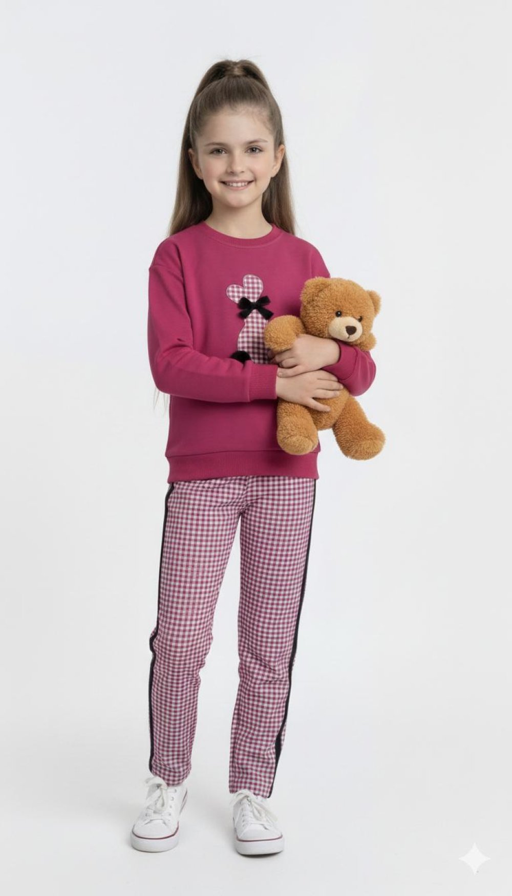 MEVSİMLİK RENKLİ ÜST PONPON TAVŞANLI ALT KARELİ YANLAR ŞERİTLİ TAKIM Fuşya