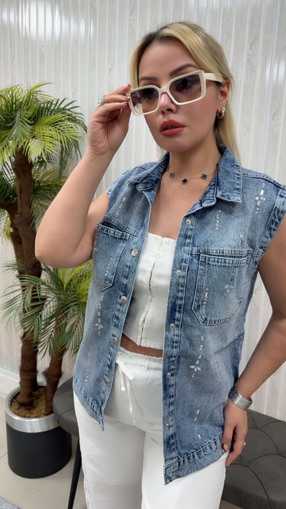 **Denim Aşkına! ?✨** Jean şıklığını taş detaylarıyla bir üst seviyeye taşıdık! Basic kombinlerinizi anında hareketlendirecek bu yelek, gardırobunuzun en joker parçası olacak. İster beyaz pantolonlarla, ister elbiselerin üzerine... * **Bedenler:** S / M / L * **Fiyat:** 800 TL * **Detay:** Işıltılı taş işlemeli, kaliteli denim doku. ? **Bu tarzı yakalamak için hemen DM üzerinden sipariş verebilirsiniz!**