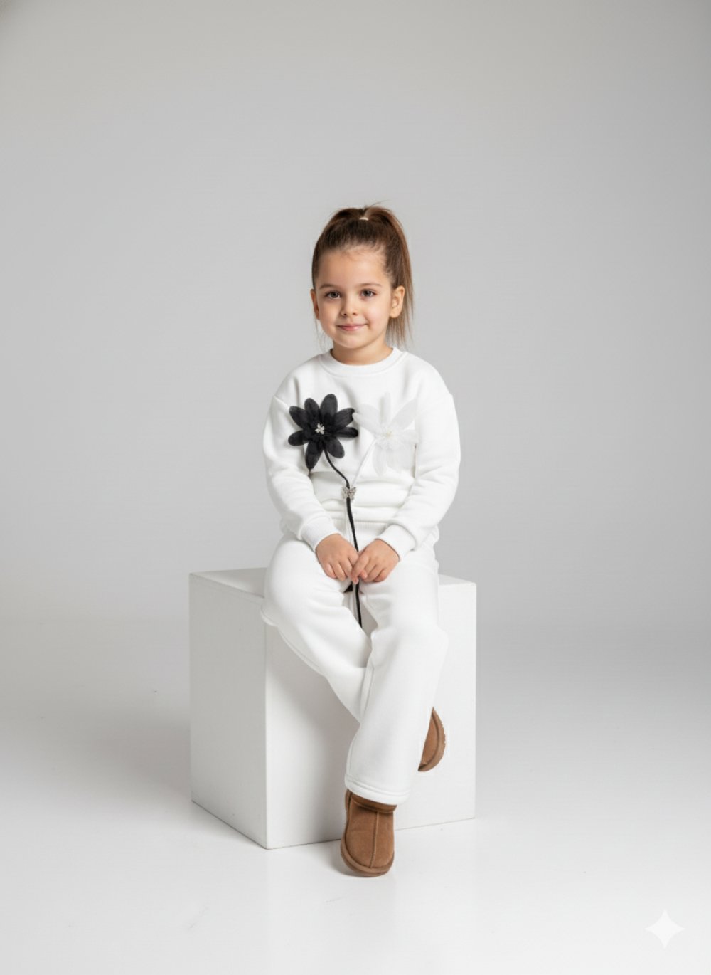 SİYAH BEYAZ ÇİÇEKLİ 3 İP ŞARDONLU KIZ TARZ TAKIM Beyaz