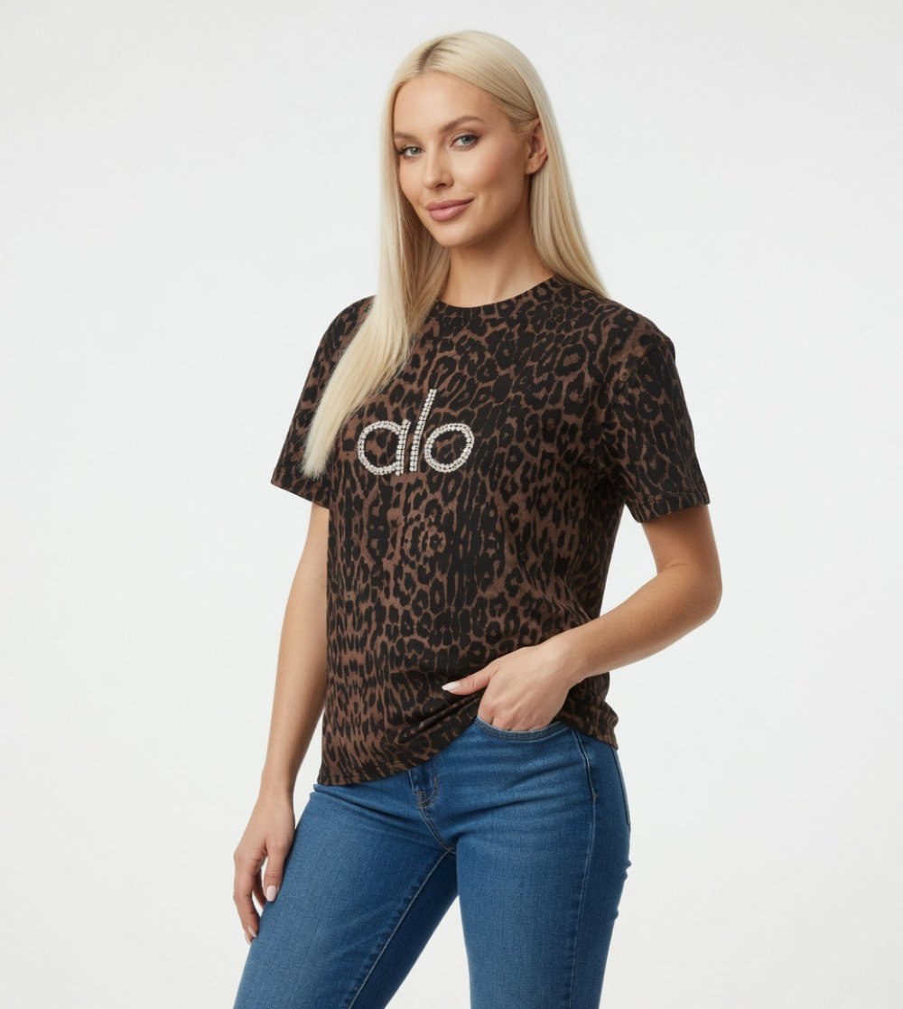 TAŞLI ALO YAZILI LEOPARLI TEK TŞÖRT Kahverengi