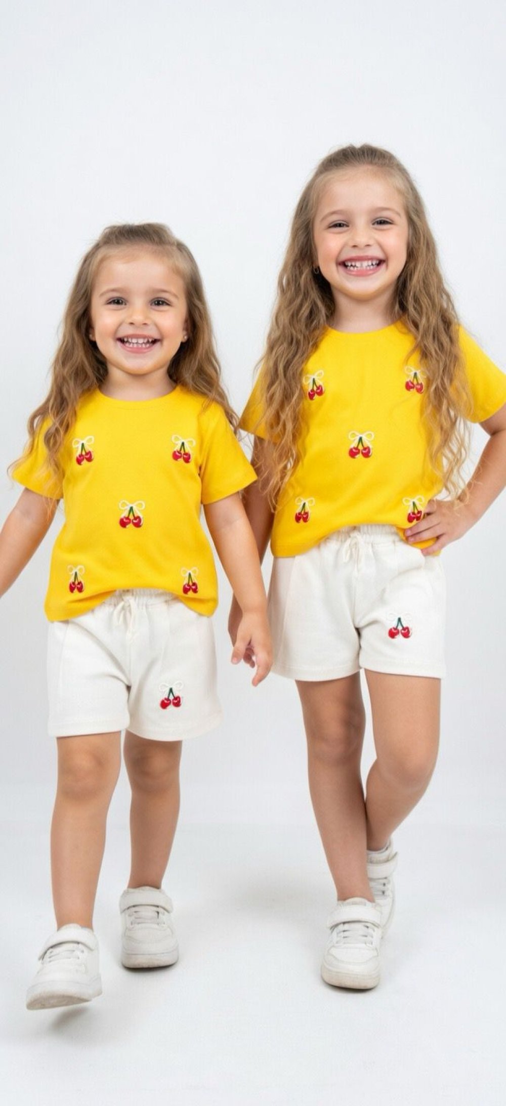 ÜST 5 KİRAZ ALT TEK KİRAZ DESENLİ ŞORTLU TAKIM Sarı