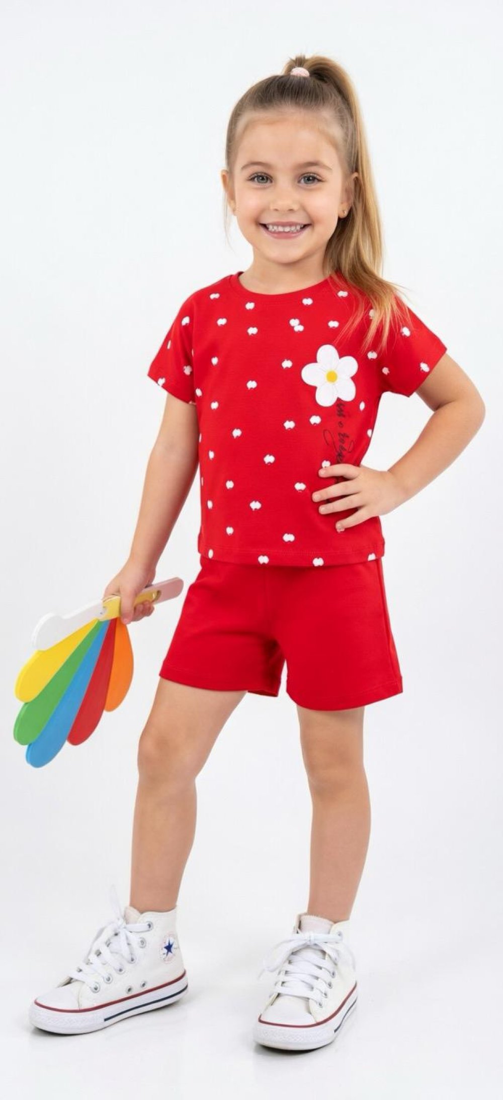 ÜST TEK VE HER YERİ PAPATYALI YAZILI ŞORTLU TAKIM Kırmızı