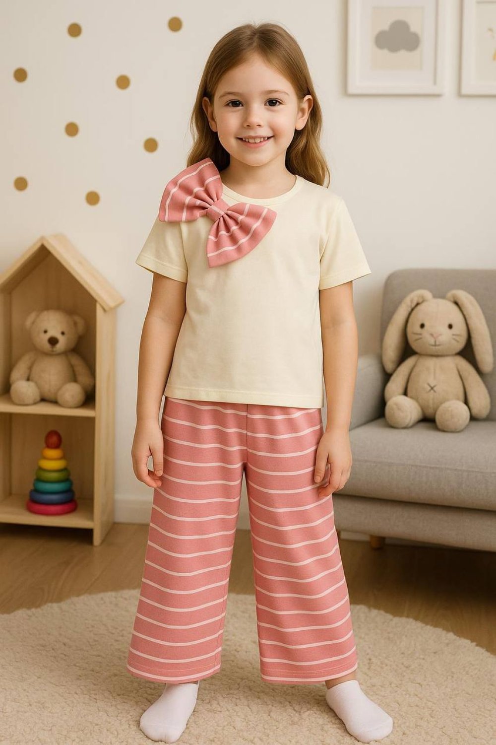 YAKASI FİYONKLU PANTOLONU ÇİZGİLİ İSPANYOL TAKIM Pembe