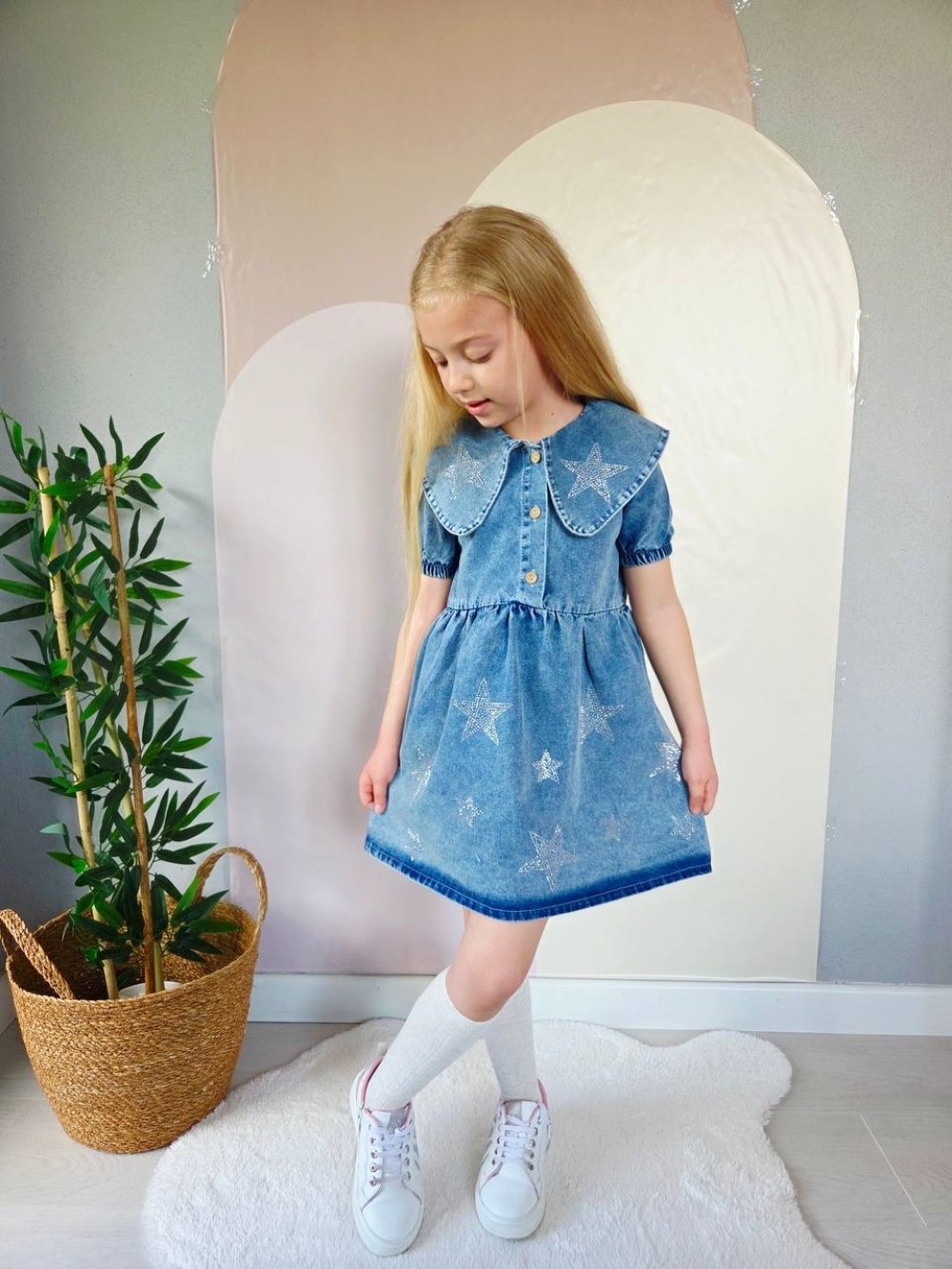 YILDIZI TAŞLI KOT ELBİSE Mavi